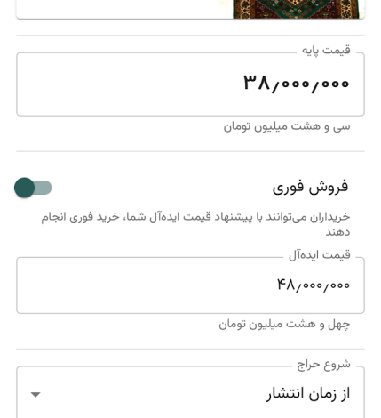 حالا میتوانید قیمت پایه، زمان شروع حراج، مدت حراج و همچنین روش تحویل را تعیین کنید.